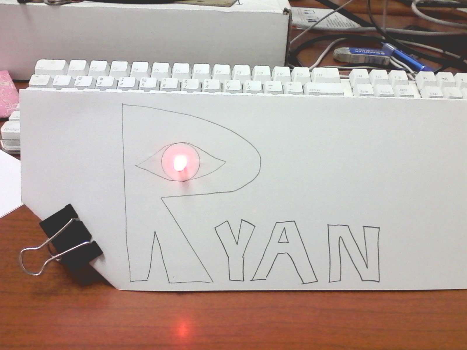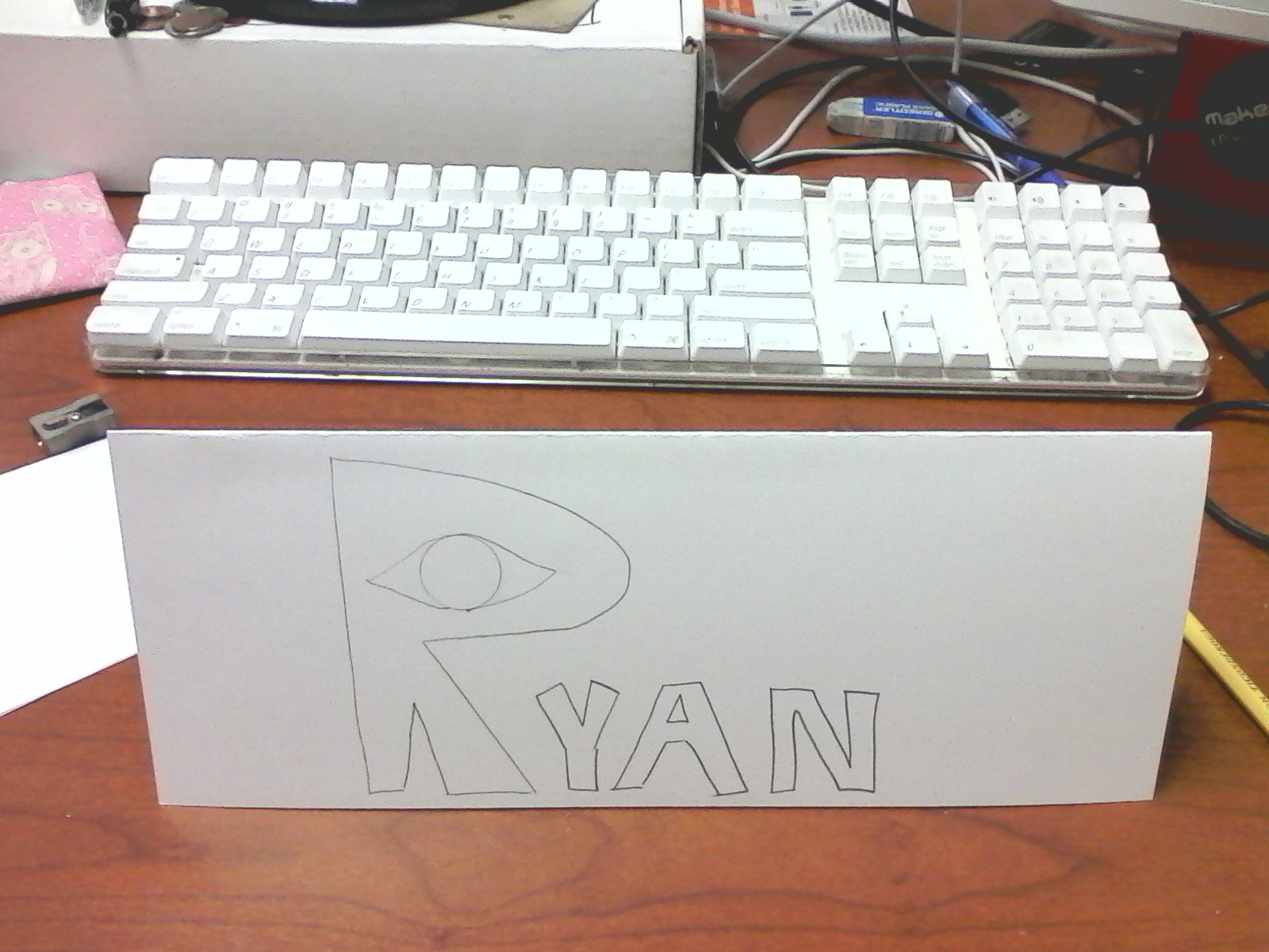 This page documents the creation of my LED enhanced name tag table tent. First I sketched my name in pencil leaving at least two inches of space on each side to leave room for a battery.