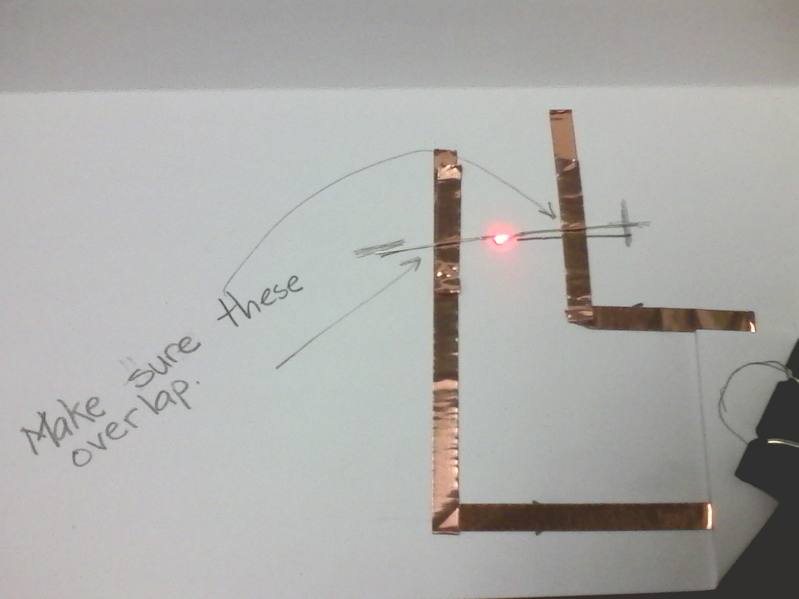 Next I run my copper lines with a continuous piece of copper from each terminal of the battery to the line for the LED. N.B. I do not have the LED through the paper at this point.